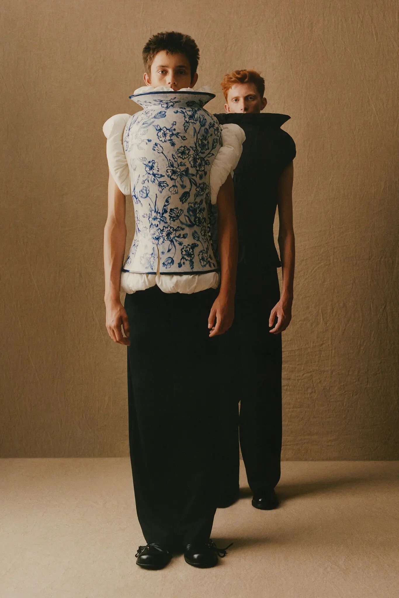 Designers have long blurred the line between art and fashion, but perhaps none quite like Daniel del Valle, 30, who works under the moniker Thevxlley. At London Fashion Week today, he’ll debut “The Narcissist,” a collection three years in the making, with pieces that incorporate all manner of materials, from ceramics to glass to flowers, and look as much like surrealist sculptures as like clothes. A piece of pottery has been repurposed as a top, and a T-shirt was constructed from short lengths of discarded Victorian-era ceramic pipes found along the River Thames. (Almost all of del Valle’s works are one-offs.) He also made use of his mother’s wedding dress, embellishing it with wax flowers, and crafted, in concert with his baker father, a look from bread. “They can be worn but are they meant to be worn?” asks del Valle. “I’m not entirely sure, but that tension is part of the project.”Del Valle grew up in a small town in Andalusia, Spain, and at 19 moved to London, where he had a stint as a floral designer and went on to make ceramic sculptures for an exhibition with the lingerie couturier Michaela Stark. “When a material or technique catches my interest, I immerse myself in it until I understand it,” says del Valle, who launched Thevxlley last year. He sees the line as an ever-evolving concept encompassing not only fashion, but also performance and maybe, someday, furniture. “It’s not just a brand but my artistic language,” he says. “The garden where all my obsessions coexist.”